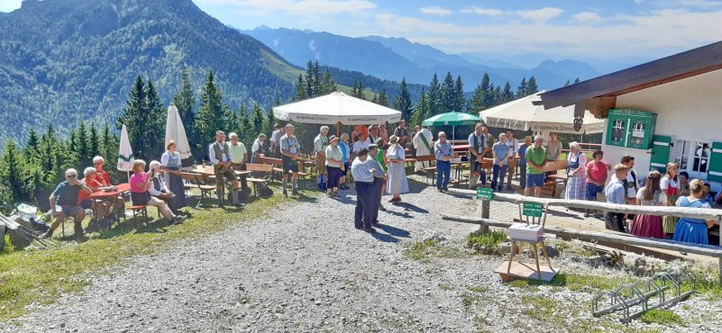 Bei schönstem Sommerwetter und unter weiß-blauem Himmel feierte die Almbauernfamilie von Bartholomäus Mayer von Samerberg-Schilding auf ihrer Feichteckalm zusammen mit Diakon Günter Schmitzberger und mit den Alm-Nachbarn eine Bergmesse. Die Gebete und die Weisen der Samerberger Bläser unter der Leitung von Michael Daxer galten dabei dem Dank für den bisherigen Almsommer und der Bitte, um einen weiteren guten Verlauf für Mensch und Vieh in diesem Jahr.