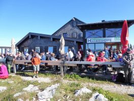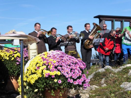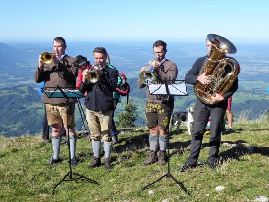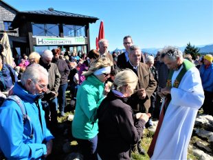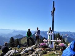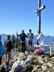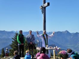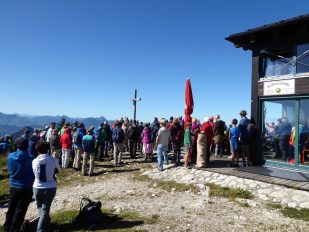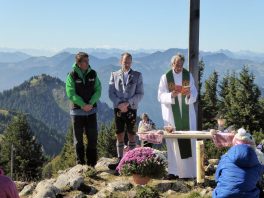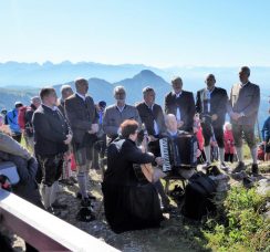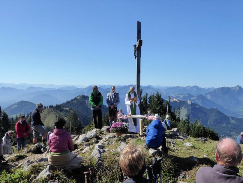 Großen Andrang bei der Hl. Kommunion hatte Pfarrer Andreas Maria Zach anl. der traditionellen Bergmesse auf der Hochries. (sh. Foto) Wie alle Jahre am letzten September Sonntag versammelten sich Bergfreunde und Mitglieder der Alpenvereinssektion Rosenheim und des Trachtenvereins Samerberg am Gipfelkreuz vor der Hochries-Gipfelhütte um ihren Gottesdienst zu feiern. Vor der unglaublich großartigen Kulisse nach Süden über das Kaisergebirge bis hinein in die Zentralalpen und nach Norden weit hinaus über das Rosenheimer Land, genossen die Besucher zudem bei strahlendem Sonnenschein und weißblauem Himmel eine einzigartige Fernsicht. Als dann der boarisch-musikalische Gesang der Samer Sänger unter Leitung von Gaby Reiserer und Hans Wiesholzer sowie die Samerberger Bläser die Messfeier umrahmten, war eine besondere Andacht zu verspüren. Bis spät in den Nachmittag wurde auf der Terrasse gemütlich gefeiert, wobei die Musikanten und Sänger ein ums andere Mal ihre Liader und Stückl zum Besten gaben.