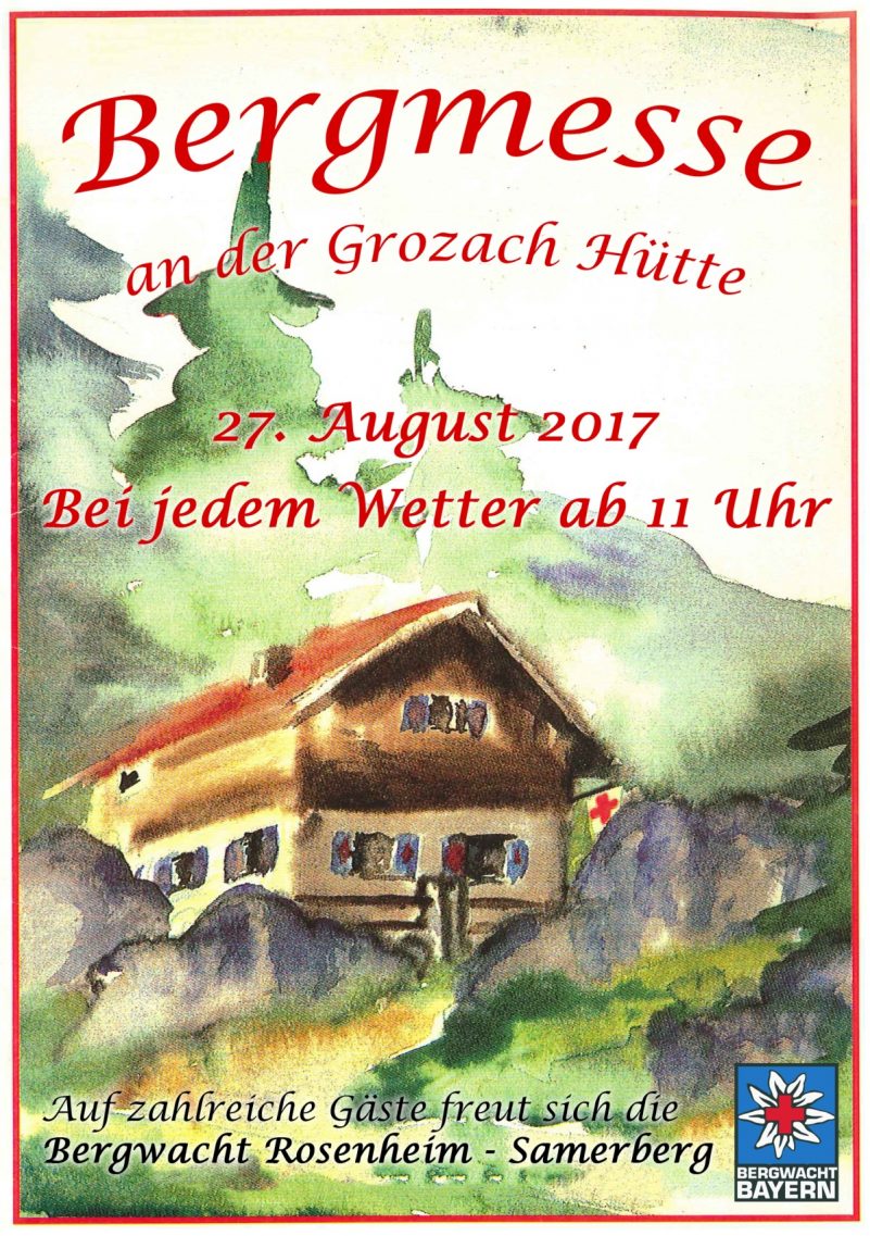 Am 27. August findet wieder die traditionelle Bergmesse der Bergwacht Rosenheim – Samerberg statt. Beginn bei jedem Wetter um 11 Uhr an der Grozach Diensthütte. Für das leibliche Wohl ist gesorgt.