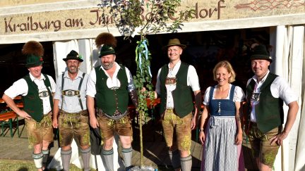 Ein Bus hatte die rund 40 Gäste nach Schleching befördert, wo Sie von Bürgermeister Josef Loferer und Andi Hell freudig empfangen wurden. Der Amtskollege aus Aschau, Simon Frank, hatte als Geschenk einen Apfelbaum dabei. Auch die beiden Tourismus Chefs Herbert Reiter aus Aschau und Elisabeth Keihl Achental Tourismus gKU freuten sich über den Besuch. Gemeinsam wurde Einzug im Festzelt gehalten. Dort erwartete sie schon die zünftige Musik der Gruppe Danzlkrainer.