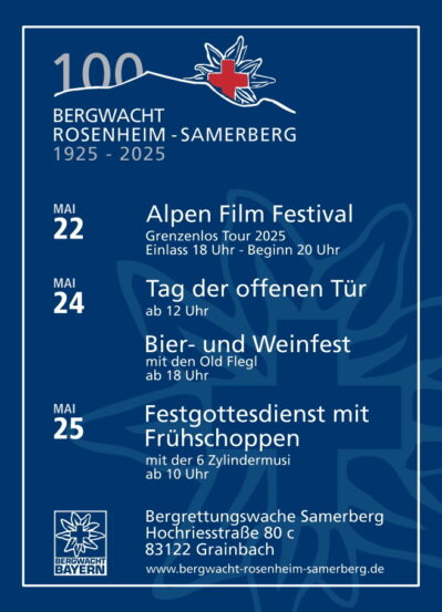 Ein rundes Jubiläum, das gefeiert werden will: Die Bergwacht Rosenheim – Samerberg wird 100 Jahre alt! Zu diesem besonderen Anlass laden wir herzlich ein, von Donnerstag, 22. Mai, bis Sonntag, 25. Mai 2025 gemeinsam mit uns zu feiern. Rund um die Bergrettungswache Samerberg erwartet euch ein vielseitiges Programm mit spannenden Einblicken und gemütlichem Beisammensein.