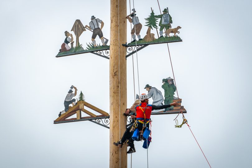 Fotos: Rainer Nitzsche – 1. Bergwachtler beim Aufstellen – 2. Die Maibaum-Kletterer