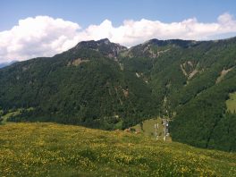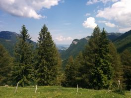 Ab hier gehts auf schmalem Pfad in Serpentinen nicht allzu steil bergauf bis zu einem Zaunübertritt zum weitläufigen Gelände der Schachenalm. Jetzt quert der Pfad aussichtsreich über freies Almgelände hinüber zur unbewirtschafteten Almhütte, wo wir auf einen von Huben heraufkommenden Fahrweg stoßen und diesem bis zu einer Sendeanlage folgen.