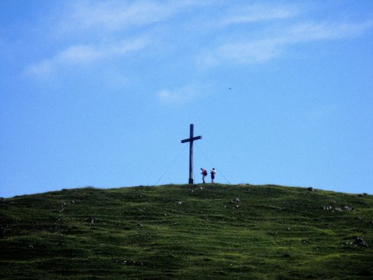 Von hier geht der Weg noch ein Stück weiter und verliert sich dann auf der Gipfelkuppe kurz vor dem Holzkreuz auf dem höchsten Punkt. Hier genießen wir ein prächtiges Panorama, sehen im Norden die Burg Hohenaschau und darüber hinaus bis zum Chiemsee, im Süden ins Inntal und auf die Alpenkette und rundherum bekannte Berge wie u.a. den Spitzstein, Wandspitz oder den Geigelstein.