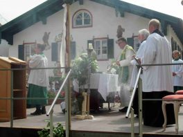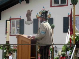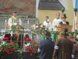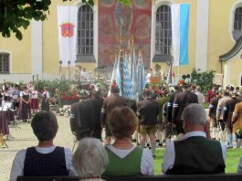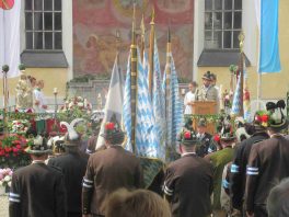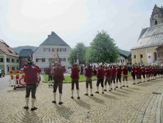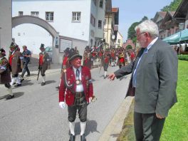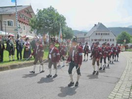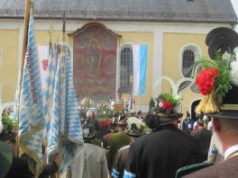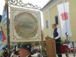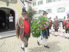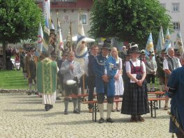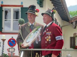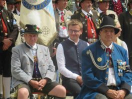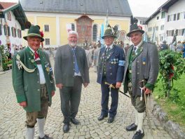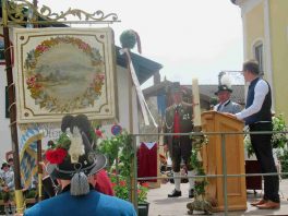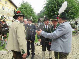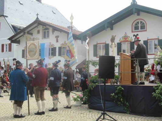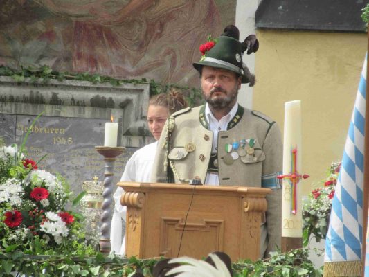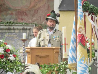 Hauptmann Sepp Stadler von der GSK Neubeuern freute sich, dass das 36. Bataillonsfest gefeiert werden konnte und sagte: „Wir feiern zwar nicht groß mit Festzelt und Festzug wie wir es geplant und gewünscht hatten, aber trotzdem finden wir den eigentlichen Sinn, denn wir beschränken uns mit einem Gottesdienst auf das Wesentliche. Schließlich ist der Gottesdienst ein Zeichen lebendiger Gemeinschaft und das tut gut in Zeiten von vielfachen Vereinsamungen“. Und er fügte hinzu: „Die Gebirgsschützen waren immer dann da, wenn sie gebraucht wurden und so sehen wir es auch heute als unsere Aufgabe, ebenso parat zu sein wie es unsere Altvorderen waren“. Für Pfarrer Christoph Rudolph, der nach einem festlichen Einzug des kirchlichen Dienstes auf der Bühne und vor der Pfarr- und Wallfahrtskirche „Maria unbefleckte Empfängnis“ den Gottesdienst feierte, sind die Bayerischen Gebirgsschützen wichtig, weil sie Förderer des christlichen Brauchtums sind und weil sie mit ihrem Vertrauen zur Mutter Gottes ihren starken Glauben an Menschen vermitteln können, die in Sorge und Not sind. Gau-Hauptmann Hans Rucker zollte der GSK Neubeuern Respekt für die Entscheidung, das schon zweimal verschobene Jubiläumsfest doch noch mit einem würdigen Gottesdienst zu feiern. Landeshauptmann Martin Haberfellner zeigte sich ebenfalls dankbar, er sagte in seinem Grußwort: „Diese heutige repräsentative Form ist ein starkes Signal, dass es uns noch gibt. Die Restriktionen, die uns Corona auferlegte und noch auferlegt sind ein guter Grund, weiterhin wachsam zu bleiben“. Stellvertretender Landrat Sepp Hofer vom Landkreis Rosenheim bat, die Heimat zu schätzen indem man nicht Flach-, sondern Tiefwurzler ist. Erster Bürgermeister Christoph Schneider von der Gemeinde Neubeuern ging als Schirmherr des Jubiläums ebenfalls auf die Bewältigung der Corona-Krise ein, er sagte: „Die Gesellschaft hat sich in den letzten Jahren rapide verändert, der Wohlstand, gerade in unserer Region, ist auf ein Maximum angewachsen und trägt dazu bei, dass sich die Menschen unabhängiger fühlen. Viele Menschen entwickeln dabei auch das Gefühl, dass sie nicht mehr aufeinander angewiesen sind und somit nur noch ihren ganz unterschiedlichen und individuellen Interessen nachgehen“. Gemeinsam mit seinem Stellvertreter Wolfgang Sattelberger übergab er an GSK-Hauptmann Sepp Stadler eine Spende in Höhe von 500 Euro sowie ein geschmiedetes Erinnerungsgeschenk. Hauptmann Fritz Dräxl von der Patenkompanie Samerberg, die auch für den Ehrensalut sorgte überbrachte in seinem Grußwort eine zuvor von Pfarrer Christoph Schneider gesegnete Schützenscheibe.