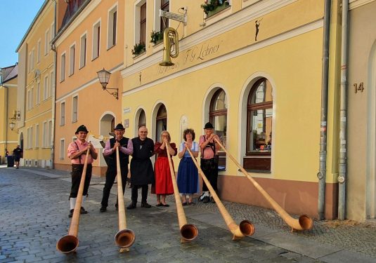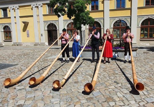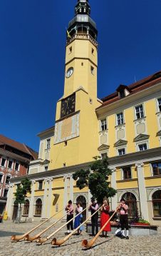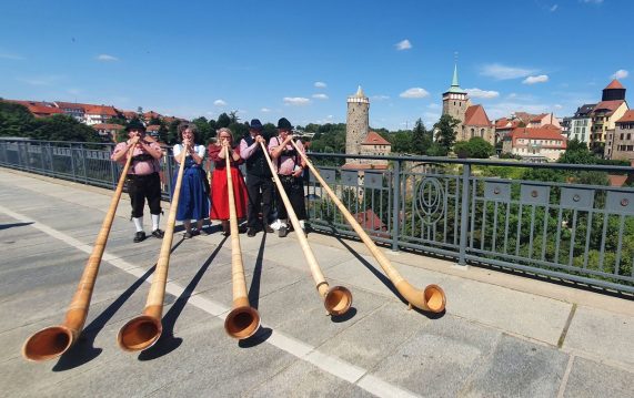 Auf seiner weiteren Tournee durch die Oberlausitz, im Rahmen des „Lausitzer Musiksommers“, machte das bayerische Ensemble auch halt in Bautzen. Ein Alphorn-Konzert auf dem dortigen Marktplatz vor dem Rathaus war für Götz Müller vom Kulturbüro der Stadt eine echte Überraschung. Daneben erschallten erstmals Alphörner vom Reichenturm der ehemaligen mittelalterlichen Stadtbefestigung. Nach einem Ständchen beim Musikhaus Löbner ging es weiter zur Seniorenresidenz in Neusalza. Ein alpines Konzert für die Bewohner war auch dort ein Novum, organisiert von der Alphornspielerin Hilla für ihre 97-jährige Tante Erika Pietsch.