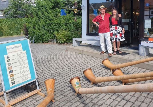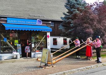 Den Abschluss der Alphorn-Tournee bildete ein Besuch im „Blauen Steine Paradies“ von Brigitte und Volkmar Ostheimer-Pietsch. In ihrem Geschäft vertreiben sie Steine jeglicher Form. Sie beraten insbesondere zum Thema der Steinheilkunde. Beide haben sich in Bayern, am Chiemsee, zusammengefunden und sind erst 2005 in die Oberlausitz, in den Luftkurort Jonsdorf, umgesiedelt.