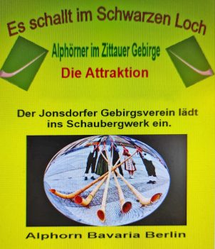 Zur Pflege der dortigen Traditionen und Heimatkultur wurde bereits 1880 der Jonsdorfer Gebirgsvereins gegründet. Schaubergwerk, Steinbruchschmiede und Sternwarte des Vereins sind die touristischen Highlights des Luftkurorts Jonsdorf. Auch Konzertveranstaltungen im „Schwarzen Loch“, dem Schaubergwerk, gehören mit zum kulturellen Programm. So erging vom Vorsitzenden des Gebirgsvereins, Volkmar Ostheimer-Pietsch, auch eine Einladung an das Ensemble Alphorn-Bavaria-Berlin, dort ein alpines Konzert zu veranstalten. Noch nie waren in dieser Gegend Alphörner in Erscheinung getreten. Es war somit eine Premiere, im „Schwarzen Loch“, vor einer einzigartigen Gebirgs-Kulisse, Alphörner erschallen zu lassen, und das in bayerischer Tracht. Mit traditionellen Kompositionen aus dem Alpenland und modernen Stücken von dem Berliner Alphornkomponisten Andreas Frey war das einstündige Konzert für die Zuschauer sicherlich ein Klangerlebnis der besonderen Art.