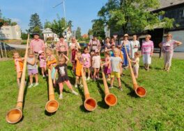 Mittags dann ein musikalisches Ständchen vor der Erntekranzbaude in Oppach, einem Ausflugs- und Speisegasstätte direkt an der B 96. Danach ging es weiter über die Grenze nach Tschechien, nach Jirikov. Dort wurden die Alphornbläser schon sehnlichst erwartet. Insbesondere waren die Jüngsten vom dortigen Kindergarten von den Klängen der kuriosen Instrumente aus dem Alpenraum begeistert. In dieser tschechischen Grenzregion war das alpine Konzert eine Premiere. Zum Dank luden Věra Vlčková und Oldřich Podzimek vom Betlemaru, dem Museum der Stadt, die Gäste aus Berlin zu einer Führung durch die einmalige Krippenausstellung ein. Ein Gemeinschafts-Konzert in Jonsdorf, im „Schwarzen Loch“, zusammen mit der Folkband „Fauler Lenz“ aus Mittelherwigsdorf, rundete den ersten Tournee-Tag stimmungsvoll ab. Bereits vor einem Jahr gab sich das Berliner Alphornensemble die Ehre, dort vor einer einzigartigen Gebirgs-Kulisse, ihre Alphörner erschallen zu lassen. und das in bayerischer Tracht. Mit traditionellen Kompositionen aus dem Alpenland und modernen Stücken von dem Berliner Alphornkomponisten Andreas Frey war das einstündige Konzert für die Zuschauer sicherlich ein Klangerlebnis der besonderen Art.