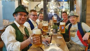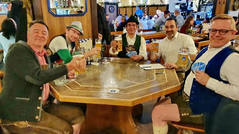Nach einer pandemiebedingten Pause von nahezu zwei Jahren ließ Franz Mayr dieses „urbayerische Brauchtum“ in Form einer öffentlichen Facebook-Gruppe „Schafkopf in Berlin“ wieder aufleben. Alle zwei Wochen trifft man sich in verschiedenen Lokalitäten zwischen Ostkreuz und Alexanderplatz, natürlich gemäß der gültigen Corona-Regeln. Zum vierjährigen Jubiläum lud Franz Mayr zu einem Faschingskehraus mit Schafkopfen ins Hofbräuhaus Berlin ein. Standesgemäß in bayerischer Tracht hat sich die Kerngruppe dort am Faschingsdienstag zum Kartenspiel eingefunden. Gewinner des Abends war Mohammed Mudhaffer. Mit weitem Vorsprung ließ der Schafkopfprofi mit irakischen Wurzeln die bayerischen Mitspieler „alt“ aussehen. Dies ist ein Beleg dafür, dass Schafkopfen längst auch als ein multikulturelles Kulturgut angesehen werden kann. Die Ursprünge des Schafkopfspiels liegen ca. 500 Jahre zurück. Erst zu Beginn des 19. Jahrhunderts kam dieses Kartenspiel aus dem Erzgebirge bzw. dem Thüringer Wald nach Bayern, wo sich dann auch der bayerische Schafkopf-Kult entwickelte. Dort wurden dann 1895 erstmals die Regeln des “reinen Schafkopfspiels” im oberpfälzischen Amberg festgelegt. Gespielt wird heutzutage jedoch nach den überarbeiteten Regeln aus dem Jahr 2009.