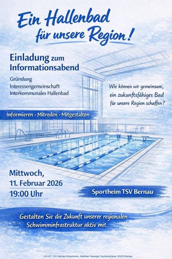 Über die Zukunft des Bades beziehungsweise eine neue Lösung haben sich die Gemeinden bereits Gedanken gemacht und im kommunalen Kreis erste Gespräche über ein regionales (Schul-)Schwimmbad geführt. Diese Idee soll mit einer breit aufgestellten Interessensgemeinschaft unterstützen werden. Dazu findet am Mittwoch, 11. Februar, um 19 Uhr im TSV-Sportheim ein erster Infoabend statt. Die Gründung der Interessengemeinschaft selber soll später folgen. Aktuell geht es darum zu informieren und Mitstreiter zu gewinnen, um die Zukunft für ein regionales (Schul-)Schwimmbad zu gestalten. Die Initiative kommt aus den Reihen des TSV Bernau.
