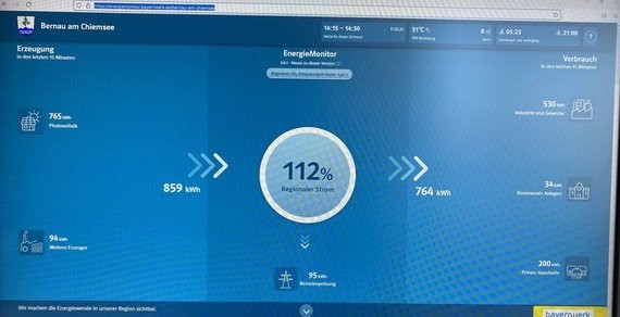 Die Gemeinde Bernau informiert: Um einen besseren Überblick über weitere energetische Planungen zu haben, hat Bürgermeisterin Irene Biebl-Daiber die Erstellung eines Energiemonitors beauftragt. Über diesen Monitor kann nachvollzogen werden, wie hoch der Stromverbrauch der Haushalte in Bernau gerade ist und wie viel davon durch die örtlichen PV- Anlagen abgedeckt sind. Bei Sonnenschein wird sogar eine Überdeckung von bis zum 112% erreicht! Im Vergleich zu anderen Gemeinden ähnlicher Größe sei dies ein sehr guter Wert, so Alexander Usselmann vom Bayernwerk, der den Energiemonitor feierlich „überreichte“. Auch bei trübem Wetter ist der Bedarf an Strom durch rund 50% eigenproduzierte Energie gedeckt. Auch Sie können den Energiemonitor einsehen unter https://energiemonitor.bayernwerk.de/bernau-am-chiemsee