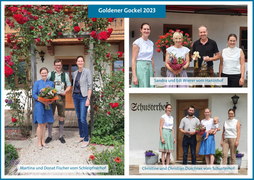 Die drei Ferienhöfe Hanznhof, Schleipfnerhof und Schusterhof sind mit dem Goldenen Gockel ausgezeichnet worden. Das angesehene Gütesiegel ehrt jährlich die 20 gastfreundlichsten Ferienhöfe in ganz Bayern und wird anhand der Gästebewertungen im Internet ermittelt. Dass von den vier Gewinnern aus dem Landkreis Rosenheim drei in Bernau beheimatet sind, freut auch Bürgermeisterin Irene Biebl-Daiber und Anja Abel, Leitung Tourismus & Marketing, die den engagierten Gastgebern zu dieser besonderen Auszeichnung gratulierten.