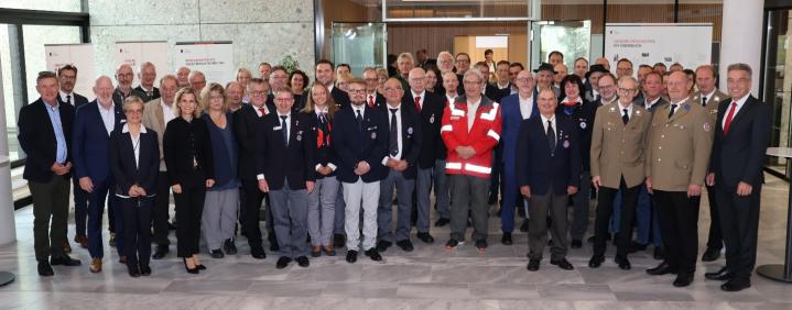 Die Geehrten gemeinsam mit Landrat Otto Lederer, der Bundestagsabgeordneten Daniela Ludwig, Johanniter-Regionalvorstand Boris Cramer, THW-Geschäftsführer Harald-Feckl sowie Falk Brem, Leiter des Amtes für Digitalisierung, Breitband und Vermessung. Zur Feierstunde im Landratsamt waren auch zahlreiche Bürgermeisterinnen und Bürgermeister aus den Heimatgemeinden der Geehrten gekommen. Foto: Landratsamt Rosenheim.