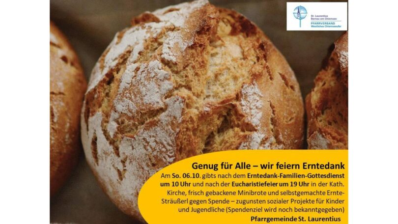 An diesem Sonntag, 6. Oktober, feiert die Kath. Pfarrgemeinde von Bernau am Chiemsee das Erntedankfest mit einer Familien-Wort-Gottes-Feier um 10 Uhr in der Pfarrkirche und um 19 Uhr mit einer Eucharistiefeier und feierlicher Orgelmusik. Nach den Gottesdiensten werden frisch gebackene Minibrote sowie selbstgemachte Erntesträußerl gegen Spende abgegeben. Der Erlös der Aktion von Ministranten und Pfarrgemeinderat geht in diesem Jahr an den Verein “Helfen am Ursprung”, der in Uganda in der Gemeinde Adilang den Bau einer Berufsschule zusammen mit örtlichen Partnern finanziert und organisiert. Der Verein sieht in der Ausbildung ein Schlüsselelement zur Lösung vieler Probleme in der jungen Bevölkerung. Ergänzend dazu sollen weitere unternehmerische und soziale Projekte die Entwicklung der Gemeinde voranbringen. Die Kath. Pfarrgemeinde freut sich über die Unterstützung der Bernauerinnen und Bernauer.