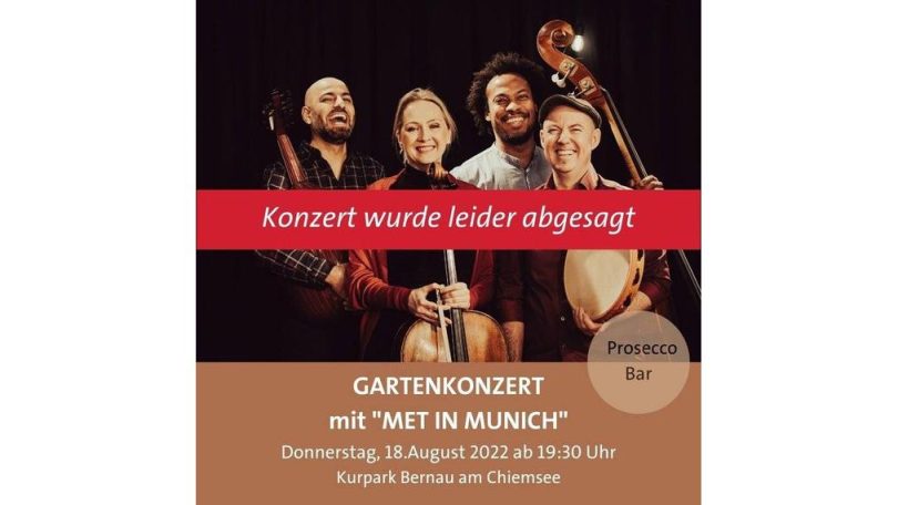 Das Gartenkonzert „mit Schubert nach Damaskus“ sollte am 18. August der krönende Abschluss der Konzertreihe im Bernauer Kurpark werden. Doch leider muss das musikalische Highlight mit dem Quartett „Met in Munich“ abgesagt werden.