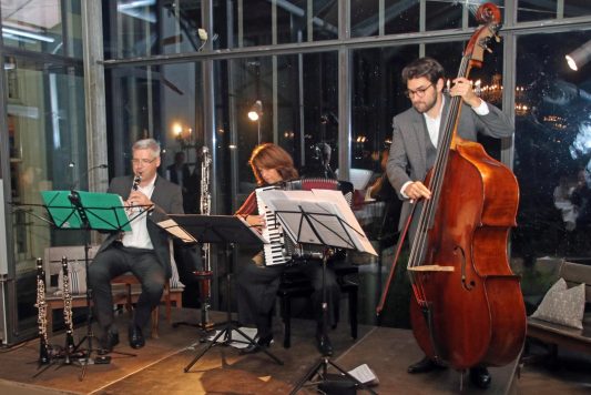 Profimusikerin Maria Reiter am Akkordeon und die Münchner Philharmoniker Albert Osterhammer an der Klarinette und Ulrich von Neumann Cosel am Kontrabass servierten nach einem Amuse-Gueule zur Vorspeise Musik, die Lust auf mehr macht – sozusagen „die Ohren wässrig macht“. Zur Kürbis-Ingwer Suppe gab es mit „Little Song“ von Alfredo d’Ambrosio und „Deepwood“ von David Bennett zwei flüssige Stücke, die warm machen.