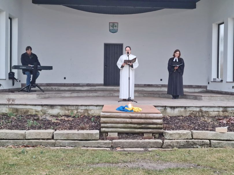 Bewegt und erschüttert vom Krieg in der Ukraine luden die katholische und die evangelische Gemeinde am 17. März zu einem ökumenischen Gebet für den Frieden ein. Etliche Menschen sind der Einladung gefolgt und haben sich im Kurpark versammelt.