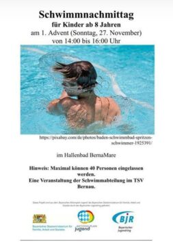 Am kommenden 1. Adventssonntag, 27. November, organisiert die Schwimmabteilung im TSV Bernau einen Schwimmnachmittag für Kinder ab 8 Jahren im Hallenbad BernaMare von 14 bis 16 Uhr. Neben dem Spaß im Wasser können auch Leistungen für Schwimmabzeichen oder das Sportabzeichen abgelegt werden. Diese Aktion läuft im Rahmen der Aktivierungs-Kampagne des Kreisjugendrings Rosenheim.