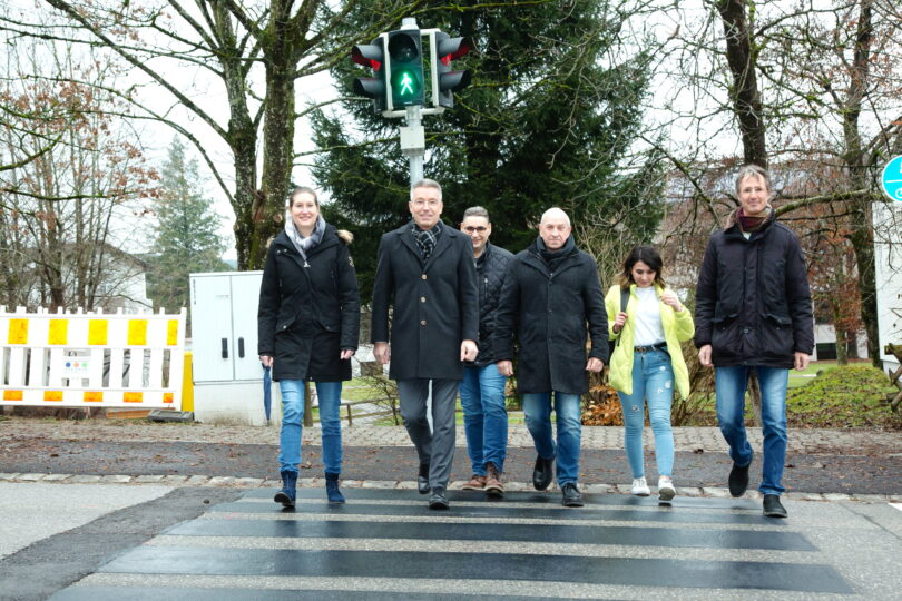 Bericht: Gemeinde Bernau a. Chiemsee – Foto: Anita Berger, Prien – Ortstermin an der neuen Ampel in Bernau: v.l.n.r.: Bernaus Bürgermeisterin Irene Biebl-Daiber, Landrat Otto Lederer, Stephan Heindl (Baufirma Heindl), Günther Glatzel, Elnaz Shamely und Florian Schmid (Sachgebiet Tiefbau des Landratsamtes Rosenheim).