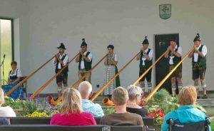 Die Bläser von links: Thomas Schmid, Franz Gnadl, Karin Pichlbauer, Donat Frey, Günter Frey, Bernhard Kreuz. Ansagerin ist – ganz links – Conny Frey, Ehefrau von Günter Frey.