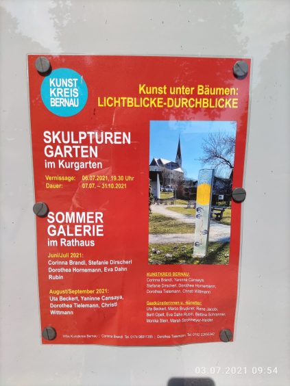Zur Eröffnungsvernissage der Bernauer Skulpturenausstellung im Rahmen des Bernauer Kunstsommers 2021 am Dienstag 6. Juli um 19 Uhr wird die Kurkapelle Bernau spielen. Erstmals nach dem langen Lockdown können wir uns wieder in einer größeren Gruppe im Freien treffen, und unser Zusammensein mit Kunst und Musik feiern, in der Hoffnung, dass diese Freiheit weiter bestehen bleibt, und dass die Pandemie allmählich zurückweicht. Für die Vernissage gelten die jeweiligen aktuellen Corona Regeln.
