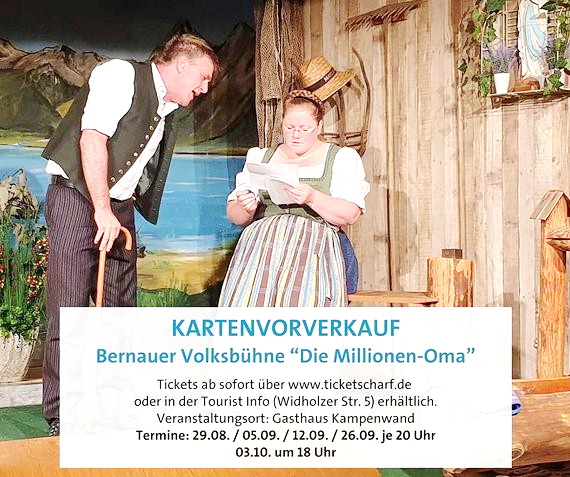 Karten gibt es an der Abendkasse im „Gasthaus Kampenwand” jeweils an den Spieltagen ab 19.00 Uhr (am 3.10. ab 17.00 Uhr) oder im Vorverkauf gegen Vorverkaufsgebühr bei der Tourist-Info (Widholzer Str. 5) sowie online über Ticket-Scharf (www.ticketscharf.de).