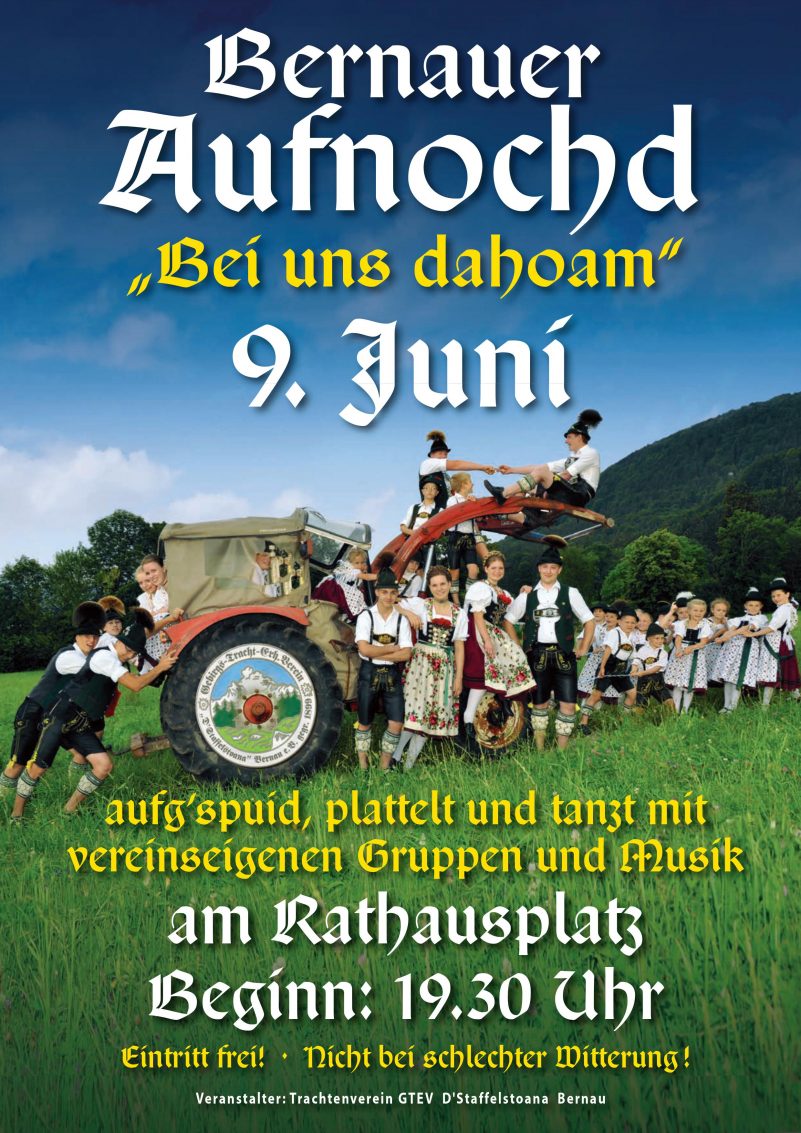 Der Trachtenverein „D’Staffelstoana“ Bernau veranstaltet am Samstag, 09. Juni und am Freitag, 22. Juni jeweils um 19.30 Uhr einen Bernauer Aufnocht am Rathausplatz. Unter dem Motto „Bei uns Dahoam“ und „Zur Sonnwend“ treten vereinseigene Musikgruppen sowie die Kinder-, Jugend und Aktivengruppe auf. Der Eintritt ist frei und für Getränke ist gesorgt. Bei Regen wird die Freiluftveranstaltung kurzfristig abgesagt.