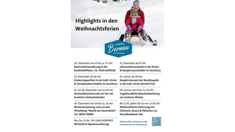 Bernau am Chiemsee lädt Einheimische wie Gäste zu einem abwechslungsreichen Programm während der Weihnachtsferien ein. Unter dem Motto „Highlights in den Weihnachtsferien“ erwartet Besucherinnen und Besucher eine Vielzahl an stimmungsvollen Veranstaltungen für alle Altersgruppen – von besinnlich bis aktiv, von kulturell bis naturkundlich.
