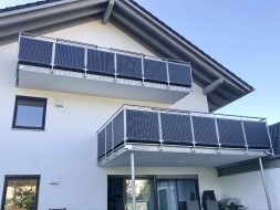 Fotos: Hötzelsperger – Bernaus Bürgermeisterin Irene Biebl-Daiber mit ihrem Elektro-Roller und einer der Balkone mit Photovaltaik-Platten