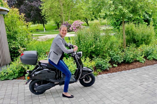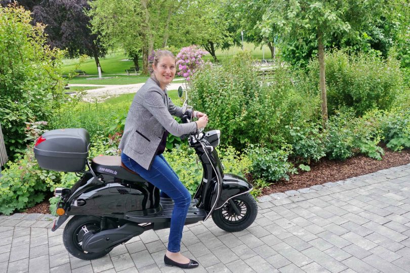 Mit Freude, Schwung und mit einem ganz besonderen Fortbewegungsmittel ist Bernaus neue Bürgermeisterin Irene Biebl-Daiber in ihr Amt gestartet. Für die vielen Wege zwischen Wohnung und Rathaus und für die vielfach zu erwartenden Ortstermine hat sie sich einen Vespa-Elektroroller zugelegt. Die Reichweite beträgt rund 40 Kilometer, was für die Amts- und Besorgungsgeschäfte innerhalb von Bernau ausreichend ist. Für die Rathaus-Chefin sind zwei Faktoren besonders wichtig: einmal die Umwelt-Freundlichkeit des Rollers und zum anderen auch der Umstand, dass anders wie beim Fahrrad ihr Kleid nicht in die Ketten geraten kann. Ein weiterer Vorteil ist, dass die oft kurzen Touren innerhalb der Gemeinde schneller als mit dem Rad und nicht länger dauernd als mit dem Auto sein werden. Irene Biebl-Daiber war vor ihrer Amtsübernahme im Lehrdienst in Altötting tätig, das bedeutete täglich einen Fahrzeit-Aufwand von weit über zwei Stunden. Das ist jetzt anders, sie ist rasch zur Stelle und das auch noch geräuschlos. Und was noch interessant ist: der Strom für den Elektro-Roller wird in ihrem Privathaus erzeugt. An insgesamt vier Süd- und West-Balkonen hat ihre Familie seit eineinhalb Jahren insgesamt 37 laufende Meter Photovaltaik-Platten angebracht, so erfolgt die Stromproduktion und Stromweitergabe direkt am eigenen Haus.