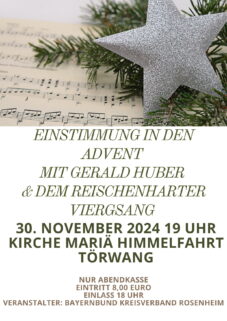 Vorankündigung: Am Samstag, den 30. November 2024, lädt der Bayernbund Kreisverband Rosenheim in die Kirche Mariä Himmelfahrt in Törwang zur Adventsveranstaltung „Einstimmung in den Advent“ ein.