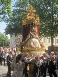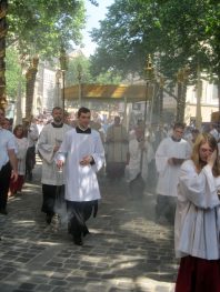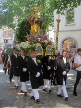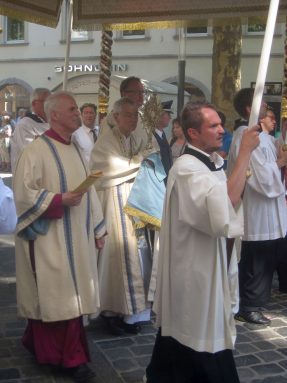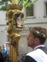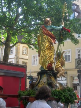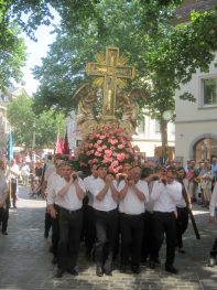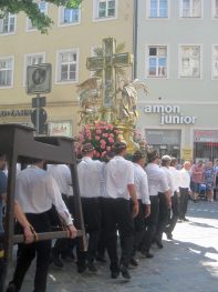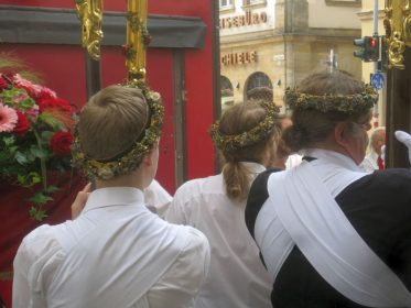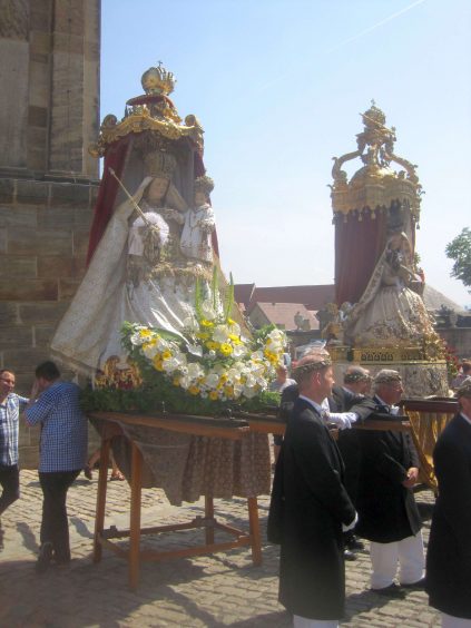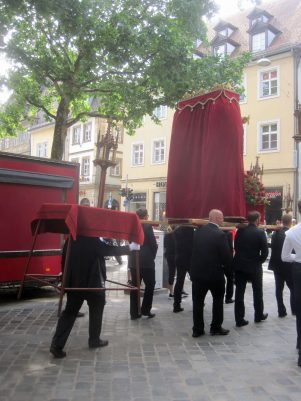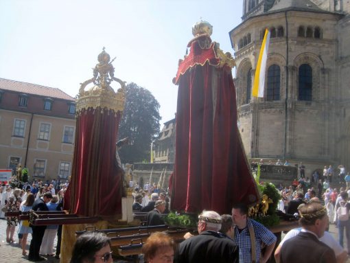 Zu den sicher eindrucksvollsten katholischen Festen in Deutschland zählt Fronleichnam, das Fest des „ Heiligsten Leibes und Blutes Christi“, das in der Mitte des 13. Jahrhunderts kirchlicherseits eingeführt wurde. Besonders feierlich wird die Fronleichnamsprozession noch heute in der oberfränkischen Bischofsstadt Bamberg abgehalten. Nach dem Festgottesdienst auf dem Domplatz, vor dem romanischen Kaiserdom, bewegt sich der lange Zug mit dem Allerheiligsten, getragen von Erzbischof Ludwig Schick, mit zahlreichen Tragefiguren der Zünfte und Bruderschaften sowie den gewaltigen Baldachinaufbauten mit dem Mariengnadenbild aus der Oberen Pfarre und der Pieta vom Beginn des 14. Jahrhunderts aus der Martinskirche durch die Straßen und Gassen der Stadt. Dabei ist es für zahlreiche Bamberger eine Ehre bei der Prozession mitzuhelfen. Allein das wertvolle, 16 Zentner schwere, Domkreuz wird von 18 Trägern bewegt. Die Gebete, Gesänge und Segensworte werden über Lautsprecher in der gesamten Altstadt übertragen, so dass sich kein Besucher der Stadt dem feierlichen Geschehen entziehen und selbst in einem der zahlreichen Cafés an der Liturgie teilnehmen kann (oder muss).