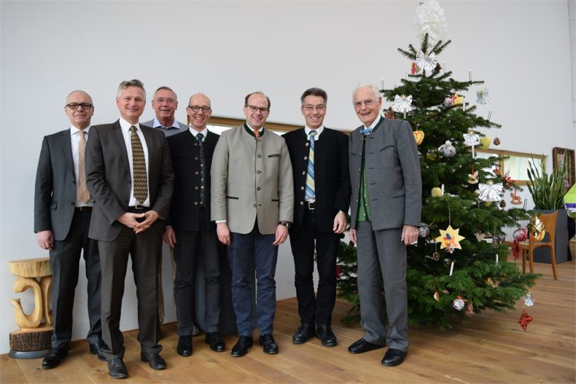 Foto: Besuch_Salus_6: v.l. Der Leiter der Finanzbuchhaltung von SALUS Georg Widhammer, Bruckmühls Bürgermeister Richard Richter, Geschäftsführer des SALUS Hauses Peter Greither, Geschäftsführer von SALUS Pharma Christoph Hofstetter, Geschäftsführer des SALUS Hauses Dr. Florian Block und der Landtagsabgeordnete Otto Lederer mit dem Geschäftsführer des SALUS Hauses Otto Greither.