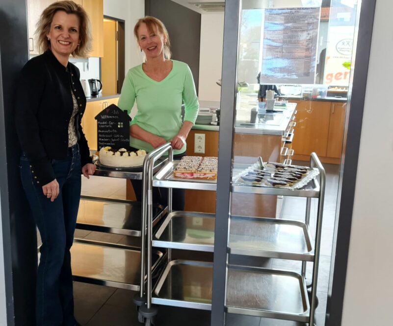Bericht und Fotos: Büro MdB Daniela Ludwig – Buergerhaus1: MdB Daniela Ludwig (li) bei der Kuchenausgabe mit der ehrenamtlichen Helferin Renate Wanzel – Buergerhaus2: Gesprächsrunde zum Bürgerhaus und zur Sozialen Stadt. Von links: Susann Schauer-Vetters (Sozialraumteam Ost, Andrea Dörries (Diakonisches Werk), Sabine Schmitz (langjährige Vorsitzende Stadtteilverein Happing) und MdB Daniela Ludwig.