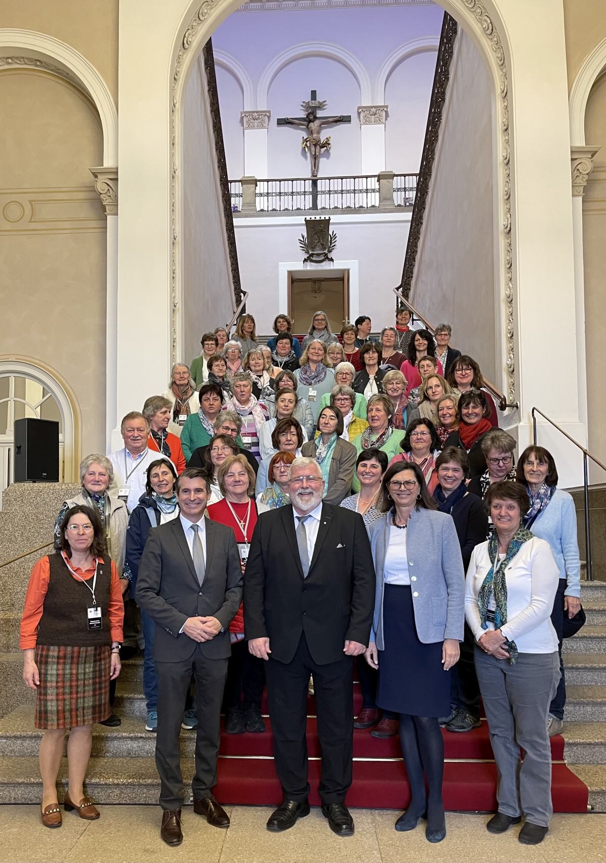 MdL Sebastian Friesinger, links Staatsminister für Europaangelegenheiten und Internationales Eric Beißwenger, rechts Landtagspräsidentin Ilse Aigner, Besuchergruppe der Kath. Frauengemeinschaft