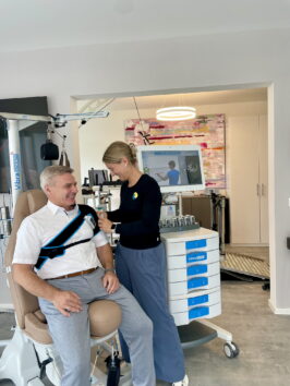 Bericht und Bilder: LRA Landshut – Landrat Peter Dreier testete ein innovatives Therapiegerät aus, das am Zentrum für Therapie und Gesundheit in Adlkofen im Einsatz ist.