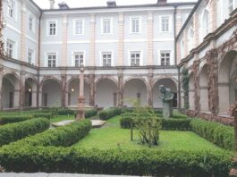 -Der begrünte Innenhof befindet sich im Gebäude des ehemaligen Franziskanerklosters, in dem heute das Tiroler Volkskunstmuseum untergebracht ist