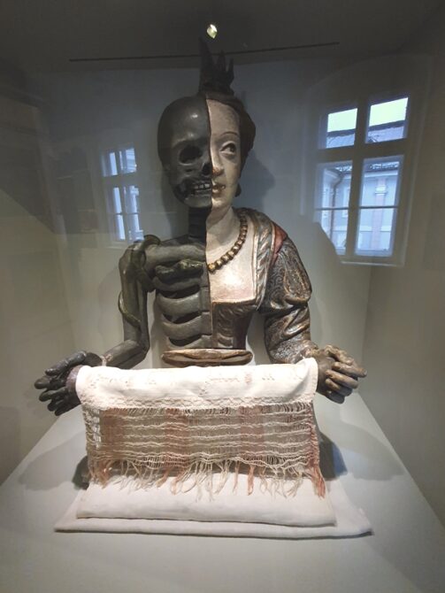 -Ein Handtuchhalter, halb Mensch, halb Skelett, erinnert an das Vergängliche
