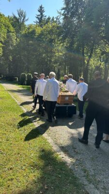 Bei der Trauerfeier auf dem Waldfriedhof von Grünwald bei München erinnerte Pfarrer Rainer Maria Schießler an das gastronomische Lebenswerk von Christl Karner und daran, dass ihr Familie und Heimat ein höchstes Gut waren. Auf Wunsch der Familie gab es zwei Trauerreden. Christine Domek-Rußwurm aus Frasdorf stellte dabei sehr berührend den warmherzigen, freundlichen Menschen und die, vielen so eng verbundenen, Freundin Christl Karner in den Mittelpunkt. Schauspieler Christian Wolff sprach aus der Sicht der vielen Stammgäste und langjährigen Weggefährten über ein liebenswertes Vorbild. Florian Lerche, von der Alpenrose Grainbach, verlas das bayerische Gedicht „Kurz is as Lebn´“, bevor die von ihr gerne als “ihre Jungs” bezeichneten Wirte der Gemeinschaft “Kulinarischer Herbst“ nach der Trauerfeier ihr in ihren Kochjacken das letzte Geleit zum Grab schenkten. Bei der Trauerfeier erklangen klassische Lieblingslieder von Christl Karner und abschließend sangen ihre Trauergäste am offenen Grab gemeinsam “Von guten Mächten wunderbar geborgen“ für sie.