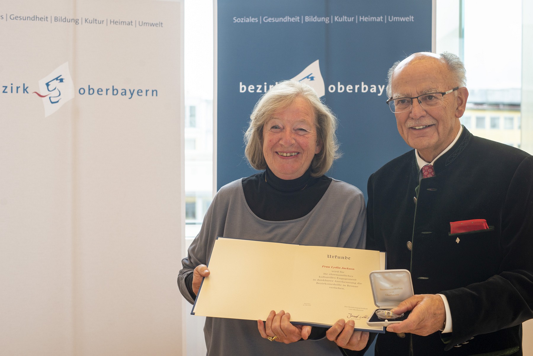 Bezirkstagspräsident Josef Mederer (rechts) überreicht die Auszeichnung an Lydia Jackson.