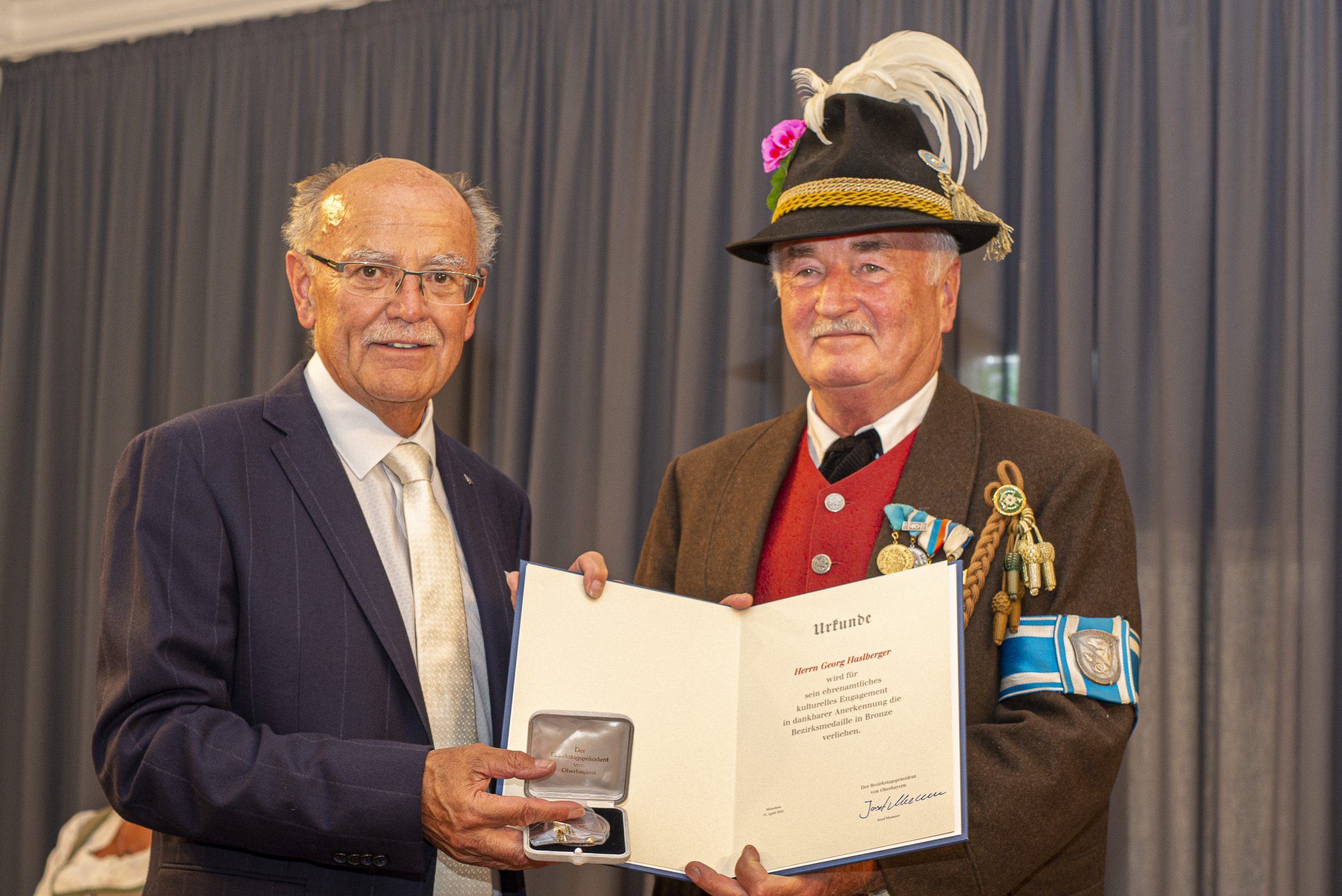 Bezirkstagspräsident Josef Mederer (links) überreichte die Bezirksmedaille an Georg Haslberger.