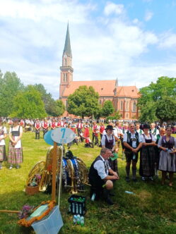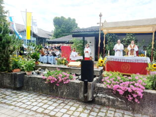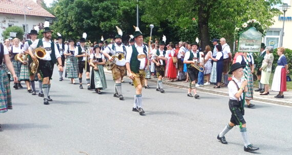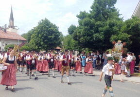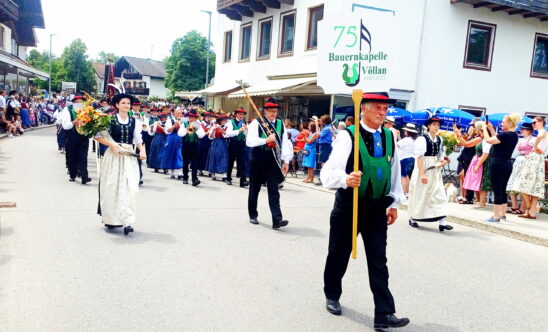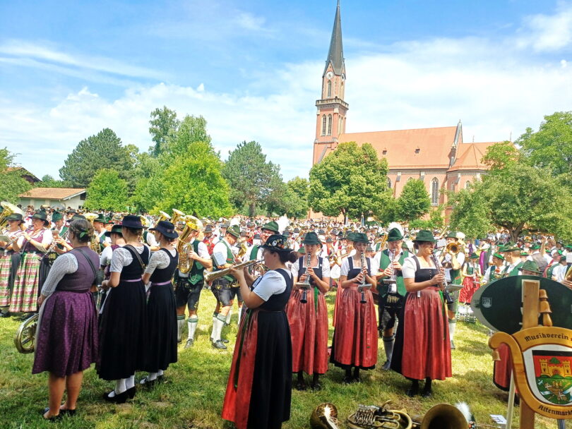 Auf der Wiese zwischen der Pfarrkirche St. Nikolaus und dem katholischen Pfarrheim zelebrierten Pfarrer Konrad Roider und Diakon Heiko Jung die Feldmesse vor Hunderten von Musikanten und Gläubigen aus dem gesamten Chiem- und Rupertigau mit Gastkapellen bis aus Südtirol und der Schweiz. Anschließend zog der mehrere Kilometer lange Festzug mit den Musikkapellen und Kutschen durch das an allen Häusern und Straßen schön geschmückte Dorf und zurück zum Festzelt in Moosen, wo gebührend weiter gefeiert wurde. Ganz Übersee und viele Schaulustige und Touristen von weither waren gekommen, fotografierten und genossen das tolle Bild der Trachten und die Blasmusik, flankiert von Trommelwirbeln. (Ausführlicher Bericht folgt).