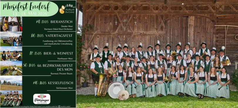 Vom 13. bis 18. Mai 2026 findet in Bad Endorf das Bezirksmusikfest des Bezirks Inn-Chiemgau statt. Die Veranstaltung steht im Zeichen der bayerischen Blasmusik und des gemeinschaftlichen Feierns.