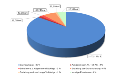 Dem Hebesatz von 22 Prozentpunkten liegt ein ungedeckter Bedarf von 2,17 Milliarden Euro zugrunde (plus 71 Millionen). 375 Millionen Euro fließen dem Verwaltungshaushalt durch Einnahmen sowie durch die Entnahme aus der Rücklage zu. Daraus ergibt sich ein Volumen von 2,54 Milliarden Euro im Verwaltungshaushalt. Basis für den Hebesatz 2024 ist die Umlagekraft von 2022. Diese war – trotz schwieriger Rahmenbedingungen wegen der Coronapandemie – leicht um 3,39 Prozent gestiegen.