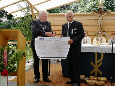 Die Blaskapelle Stephanskirchen und der Männergesangsverein umrahmten den Festgottesdienst musikalisch. Wie Pius Graf, der Obmann der Interessengemeinschaft der Krieger- und Veteranenvereine sowie der Soldatenkameradschaften im Landkreis Rosenheim, in seinem Grußwort sagte, gelte es weiter am Frieden zu bauen und an den Gedenkstätten für die verstorbenen Kameraden festzuhalten. In diesem Sinne übergab er einen Scheck über 4000 Euro an Heinrich Rehberg, den Vorsitzenden des Bezirks Oberbayern im Volksbund Deutsche Kriegsgräberfürsorge. Diese 4000 Euro sammelten die Teilnehmer der Reise der IG Rosenheim bei der Rückfahrt im Sonderzug von Mecklenburg ins Rosenheimer Land. Rehberg dankte den Veteranenvereinen für die alljährliche Kriegsgräbersammlung. „Wer außer euch sollte das in Zukunft machen?“ Nach dem Wegfall der Soldaten der Bundeswehr laste die Verantwortung für den Erhalt der Friedhöfe und der Kriegsgräber nun vor allem auf den Schultern der Traditionsverbände.