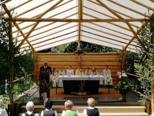 In seiner Predigt erinnerte sich Pfarrer Orsetti an einen mehr zufälligen Besuch auf dem Soldatenfriedhof von Costermano nahe dem Gardasee, der sich ungewollt lange ausdehnte. „Auf diesem Friedhof ruhen mehr als 22000 Soldaten und andere Kriegstote. Ihre Gräber erinnern die Lebenden an das Leid des Krieges. Ihr Sterben mahnt uns, den Frieden zu erhalten“. Ein Gang durch die unendlichen Reihen der Steine mit den Geburts- und Sterbedaten dieser vorwiegend jungen Leute, die noch in den letzten Kriegstagen 1945 starben, erinnert die Besucher der Kriegsgräberstätte daran den Frieden im Kleinen, wie im Großen zu bewahren. Eine kleine Kapelle wird als Gedenkraum des Kameradengrabes genutzt. Vor dem Kameradengrab kniet ein Jüngling, eine Bronzefigur von großer Ausdruckskraft. Ebenso wie die zahllosen Kriegerdenkmäler in unseren Gemeinden dient diese Figur als Andenken, Mahnung und Erinnerung. „Der Mensch steht nicht über allem, er hat sich an seinem Platz in die Schöpfung einzuordnen“.