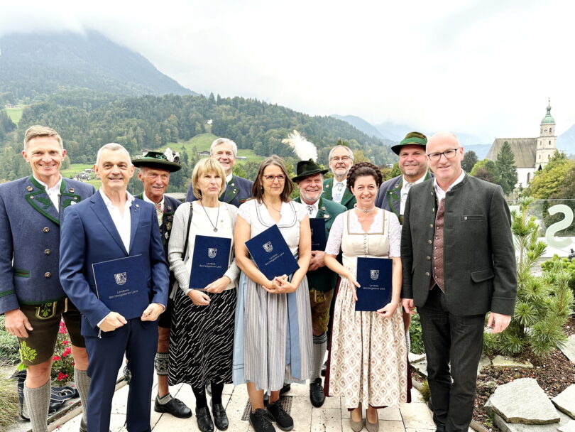 Bericht: LRA BGL / Foto: Privat –  Die Teilnehmer der Feierstunde von links: Berchtesgadens Bürgermeister Franz Rasp, Rupert Haueis, Josef Wenig, Doris Angerer, Bischofswiesens Bürgermeister Thomas Weber, Birgit Dörrich, Albrecht Zollhauser, Teisendorfs Bürgermeister Thomas Gasser, Barbara Aicher, Thomas Resch, 2. Bürgermeister Bischofswiesen, und Landrat Bernhard Kern.