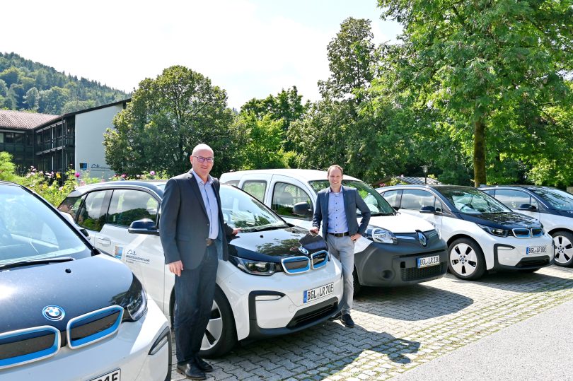 Bericht und Foto: LRA BGL – Die E-Flotte des Landkreises mit Landrat Bernhard Kern und Klimaschutzmanager Manuel Münch (r). Im Fuhrpark des Landratsamtes sind 5 Fahrzeuge – und damit die Hälfte des Fuhrparks – rein elektrisch unterwegs.