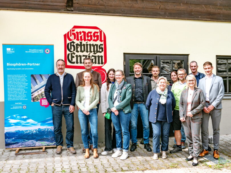 Bericht und Foto: Regierung von Oberbayern: V.l.n.r.: Hannes Lichtmannegger (Berghotel Rehlegg), Florian Beierl (Enzianbrennerei Grassl), Bernadette Kneis (Biosphären-Verwaltung), Marie Detmer (Biosphären-Verwaltung), Barbara Steiner-Hainz (Molkerei Berchtesgadener Land), Dr. Peter Loreth (Biosphären-Verwaltung), Max Irlinger (Enzianbrennerei Grassl), Birgit Wall-Höhn (Ferienwohnungen Wassererlehen), Barbara Linder (Meisterwurz-Gärtnerin), Dr. Hans Lecker (Biohof Lecker), Teresia Petram (Sparkasse Berchtesgadener Land), Christian Wieninger (Privatbrauerei M.C. Wieninger), Simon Koch (Sparkasse Berchtesgadener Land)